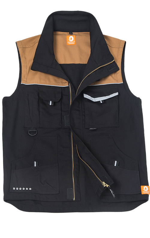 WK01 Vest Material: Canvas 65% polyester 35% cotton 320gsm. Left breast pocket with flap and Velcro fastenings right with mobile phone and pen compartments. 2 large side pockets with Cordura® reinforcement. Adjustable waistband with Velcr
